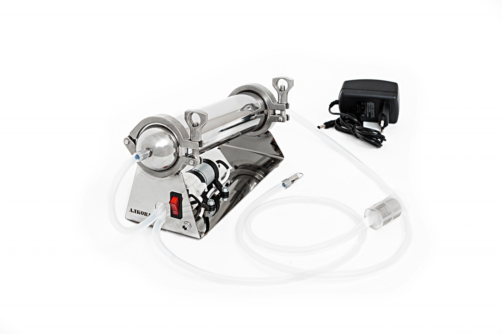 Использовать фильтр очень просто: Картридж устройства заполняется кокосовым углем. Готовый дистиллят заливаем в какую-нибудь емкость. Опускаете в емкость оба шланга и включаете насос. Продукт начинает циркулировать через фильтрующее устройство, очищаясь и смягчаясь.